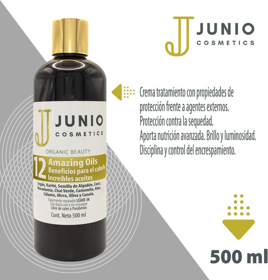 TRATAMIENTO 12 ACEITES ESENCIALES PARA NUTRIR TU CABELLO 500ML SIN SAL NI PARABENOS JUNIO COSMETICS
