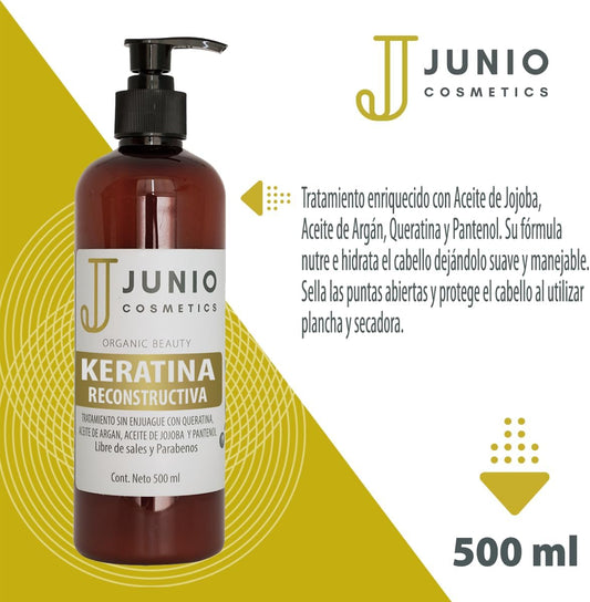 TRATAMIENTO KERATINA RECONSTRUCTIVA CON ACEITE DE ARGAN, ACEITE DE JOJOBA Y PANTENOL; SIN ENJUAGUE 500ML